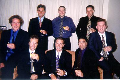 Standing: Mr Jade, Mr Invisible and Mr RedSitting: Mr Slate, Mr Green, Mr Cherry, Mr Blonde, Mr Magenta.